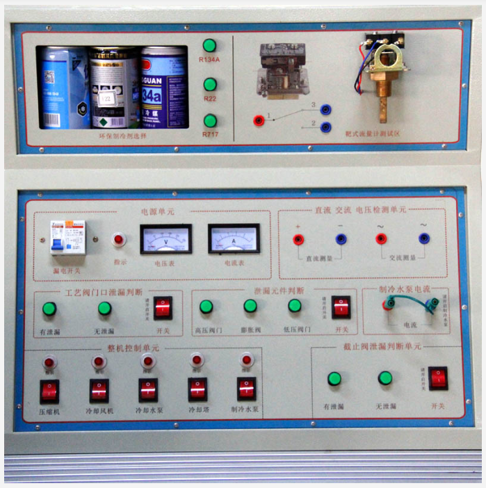 LG-TZL02制冷與空調(diào)運(yùn)行操作實(shí)訓(xùn)設(shè)備根據(jù)《制冷與空調(diào)設(shè)備運(yùn)行操作作業(yè)安全技術(shù)實(shí)際操作考試標(biāo)準(zhǔn)》研發(fā)。采用蒸汽壓縮式制冷循環(huán)系統(tǒng),配備全封閉式制冷壓縮機(jī)、冷凝器、蒸發(fā)器等制冷系統(tǒng)真實(shí)部件,并設(shè)有智能溫度調(diào)節(jié)儀、流量計(jì)、壓力表、電壓表、電流表等測量儀表??己艘詫?shí)際操作、仿真模擬操作完成。