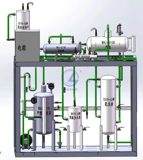 整套裝置由鋼制安裝框架、甲醇計(jì)量槽、甲醇汽化器、氣體混合器、氧化器、仿真儀表、就地計(jì)算機(jī)操作臺(tái)、、就地智能儀表控制上位監(jiān)控軟件、外置配套設(shè)備等組成,工藝路線簡潔清晰,現(xiàn)場儀表與通訊模塊有機(jī)結(jié)合,上位計(jì)算機(jī)控制,設(shè)置DCS界面及自動(dòng)評分系統(tǒng)。