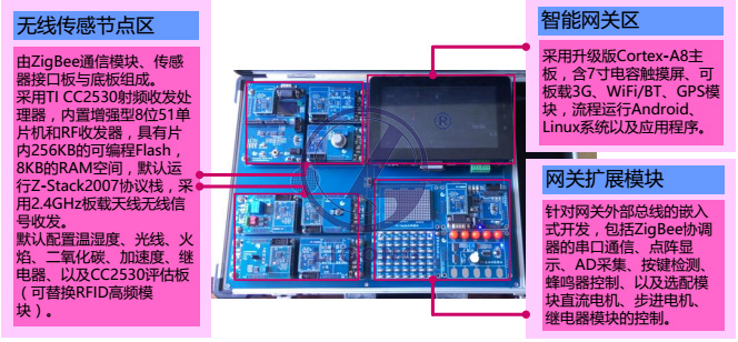平臺主要包括 ZigBee 無線傳感器節(jié)點、升級版 Cortex-A8 智能網(wǎng)關、以及網(wǎng)關擴展模塊等硬件資源。如圖所示: