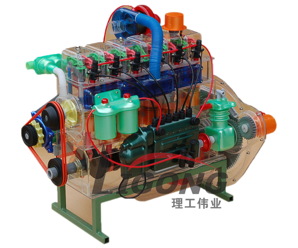透明發(fā)動機模型外殼選用透明有機玻璃制作,內部部件均以硬質塑料料加工,用螺絲固定在金屬高溫烘漆而成的鐵架子上??偝刹糠侄家詨耗3尚渭庸?,代替過去膠粘合的方法,使產品在強度上有很大提高。發(fā)動機總成模型用直流電機驅動,能演示發(fā)動機內部曲軸、活塞、氣門等運行情況,點火系統采用燈光演示,能根據實際發(fā)動機運行時的點火順序進行演示。