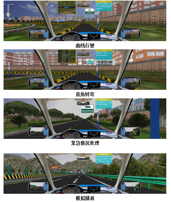| 道路場(chǎng)景 | 炫目道路:(朝九晚五的太陽(yáng))炫目會(huì)車,炫目駕駛鄉(xiāng)村道路等。泥濘道路:泥濘洼地道路駕駛(方向、制動(dòng)、驅(qū)動(dòng)有打滑滯后感)場(chǎng)景模型取鄉(xiāng)村道路,道路變?yōu)槟酀魻顟B(tài)。石子路面:汽車在其上面行駛,遇到剎車時(shí)剎不住車,還可汽車還在繼續(xù)滑動(dòng),有時(shí)還會(huì)斜向滑行,極難控制感,汽車在石子路面里滑動(dòng)。涉水道路:涉水駕駛汽車有水流沖力對(duì)車輛的前進(jìn)阻力感光及側(cè)滑感,輪胎與水下的路壓力減小,驅(qū)動(dòng)力受到限制,使行駛受阻感覺。專項(xiàng)訓(xùn)練:要附合交通部要求。系統(tǒng)評(píng)分:每次駕駛結(jié)束,系統(tǒng)自動(dòng)評(píng)分。山區(qū)到路:突出坡多、彎多、凹凸路面、駕駛環(huán)境復(fù)雜、有側(cè)風(fēng)、有陡坡長(zhǎng)坡、溜坡、側(cè)滑(有語(yǔ)音提示)。鄉(xiāng)村道路:含鐵道路口;加油站,公交車站、單行道、農(nóng)田道口等;城市道路:含公交站臺(tái),高架立交橋、公交專用道、十字路口、丁字路口、環(huán)島、隧道、單行道、雙黃線、加油站、商場(chǎng)百貨門口斑馬線天橋,學(xué)校門口及紅綠燈,行人、非機(jī)動(dòng)車亂穿馬路及非機(jī)動(dòng)車等。高速公路:包括收費(fèi)站(入、停、出、)服務(wù)區(qū)、緊急帶、匝道行駛、超車道、行車道、隧道、立交橋、交通標(biāo)牌標(biāo)線。危險(xiǎn)場(chǎng)景:視線不清的交通情況下,超車后突然切入他人道引起被超車輛緊急制動(dòng)、自行車、行人突然橫穿馬路,路面維修,障礙物繞行等 危險(xiǎn)場(chǎng)景、 | |