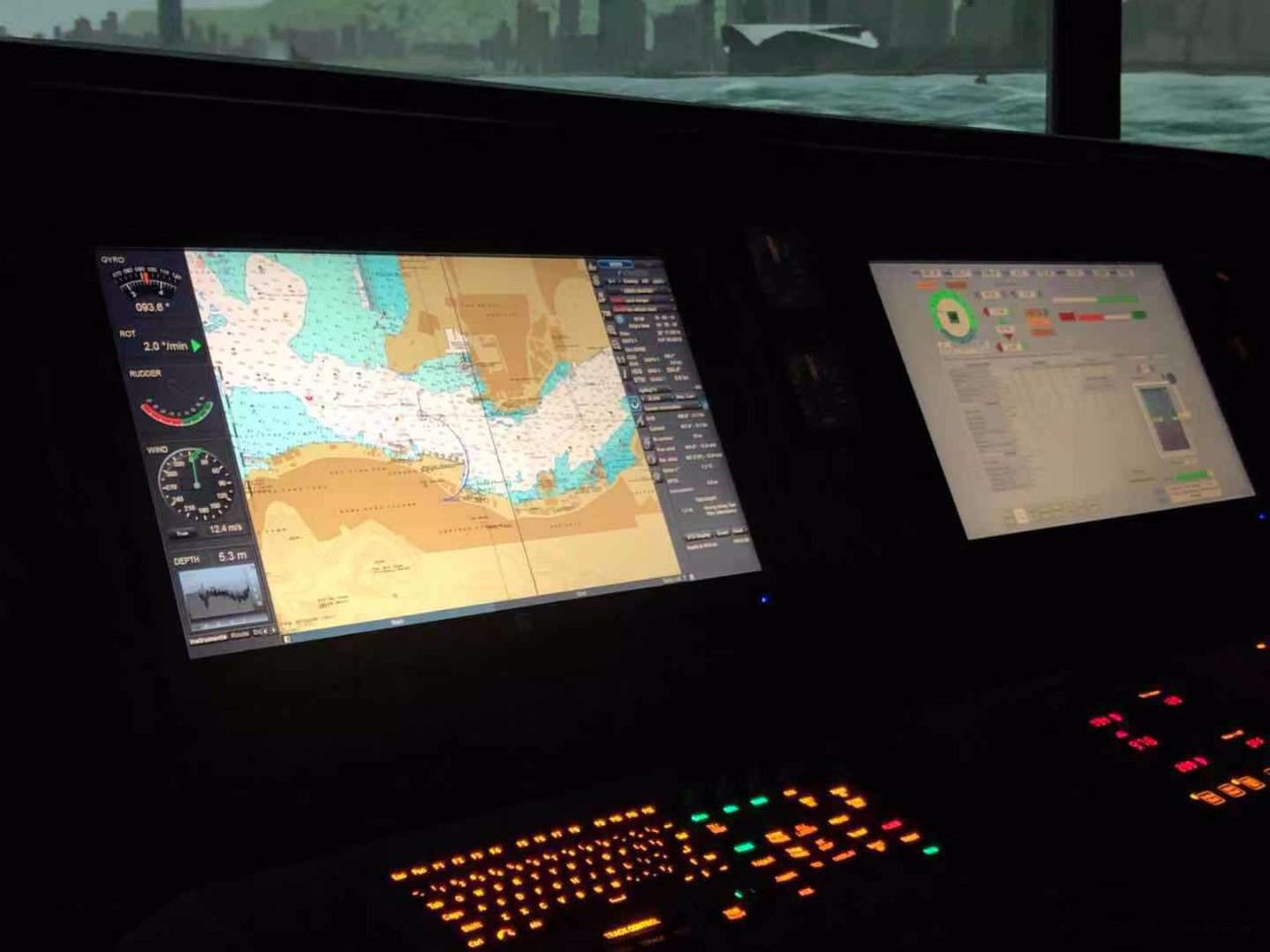 LGM-CB03T型 高速艦艇航海訓練模擬器船舶駕駛室內有雷達、測深儀、GPS、AIS、電子海圖等高科技設備,窗外是寬闊的江面。公司研制的船舶操縱模擬器的建設以高速巡邏艦艇駕駛室為模擬器原型并在此基礎是兼顧了海船的特點,方案的建設內容為船舶操縱模擬器1套,其中包括教練員站1套,120度水平視場角本船1套(采用3通道液晶電視顯示)。本船系統(tǒng)主要由船舶控制模塊、雷達模塊、電子海圖模塊、通訊模塊、導航儀器模塊、音響模擬模塊等構成,其功能和布置與實船基本一致。