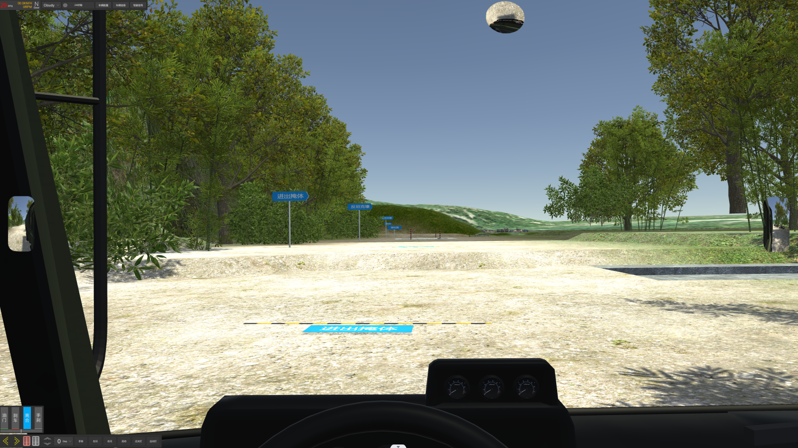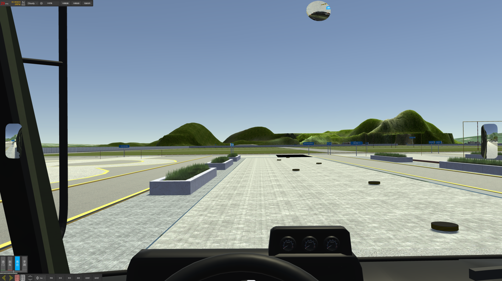 2、軟件主界面:?jiǎn)?dòng)畫面后,界面下方同時(shí)顯示:油門、剎車、轉(zhuǎn)向、離合器深淺進(jìn)度均有顯示。視景120度全新廣角寬頻駕駛模擬,界面顯示各項(xiàng)指示燈、文字提示框、檔位位置、訓(xùn)練成績(jī),后視鏡(左、右、中)后視鏡可調(diào)節(jié)、訓(xùn)練線路圖均有顯示。