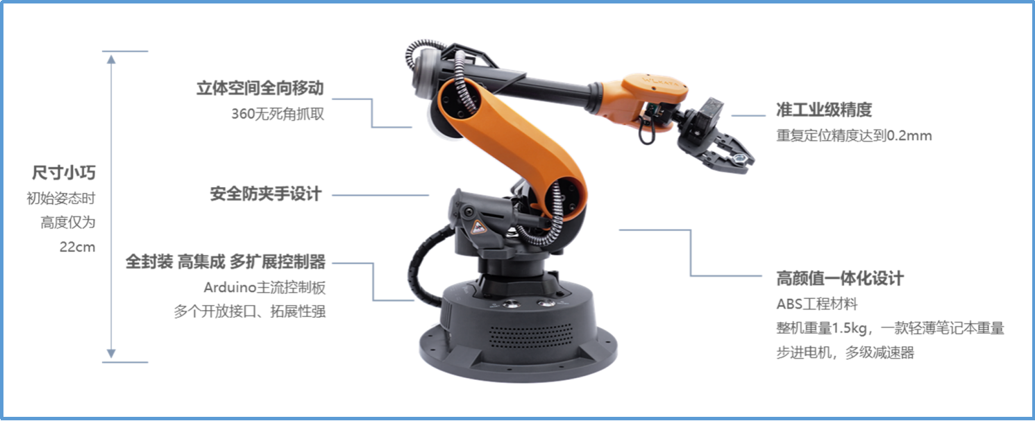Mirobot六軸機器人可完成機器人搬運碼垛、裝配、軌跡規(guī)劃等典型任務(wù),同時可實現(xiàn)寫字畫畫、激光雕刻等多種功能,支持PC端Studio、手機APP、示教器等控制方式。