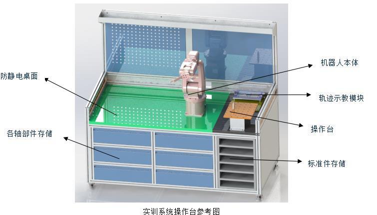 2、平臺分為兩部分:一部分為機器人本體拆裝實訓(xùn)區(qū)域,一部分為拆裝好定位及精度調(diào)試區(qū)域。