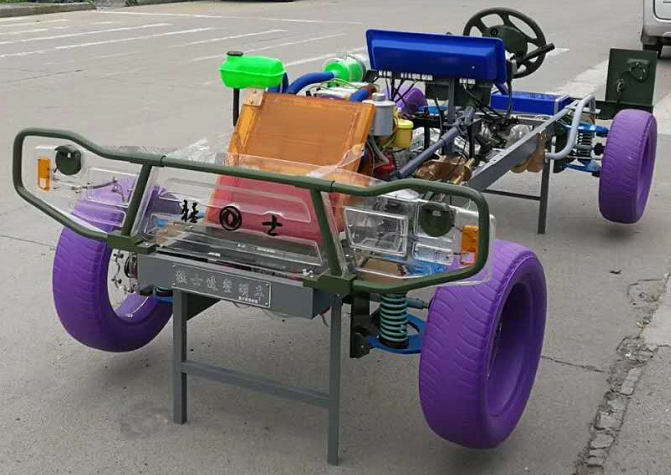 東風(fēng)猛士透明整車模型(EQ2050B猛士)選用透明有機(jī)玻璃制作,內(nèi)中部件均以硬質(zhì)塑料料加工,用 螺絲固定在金屬高溫烘漆而成的車架上。各總成部分都以壓模成形加 工,代替過去膠粘合的方法,使產(chǎn)品在強(qiáng)度上有很大提高。發(fā)動機(jī)總成用電機(jī)驅(qū)動,在油門處設(shè)有調(diào)速裝置,能演示發(fā)動機(jī)轉(zhuǎn)速高低。離合器分離明顯,操縱靈活,離合器外殼整體壓模而成,變速箱和各檔齒輪用各種顏色表示,換檔靈活,手制動美觀。后橋外形壓模而成,內(nèi)中主減速、差速轉(zhuǎn)動自如,輪轂剎蹄壓模成型,剎蹄可調(diào)節(jié),前橋輪鼓可調(diào)整,轉(zhuǎn)向裝置以及電瓶、油箱、水箱,制動管路分布清楚一目了然。電路采用對插件前后分布,燈架、風(fēng)窗、儀表板、后燈架用透明有機(jī)玻璃壓模成整體美觀逼真。