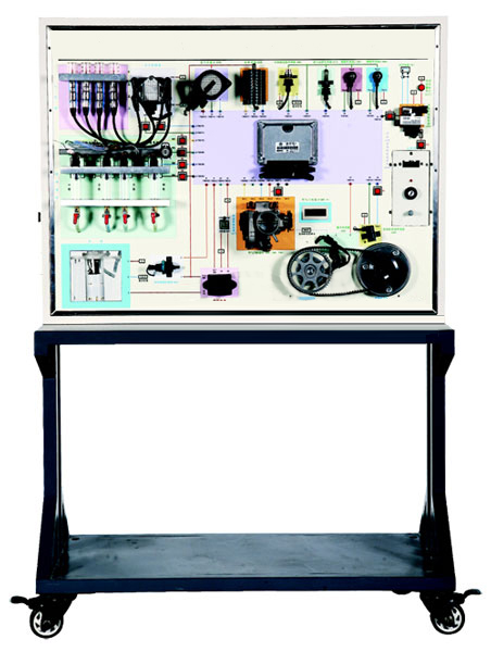 汽車汽油發(fā)動機電控系統(tǒng)示教板完整展示了上海大眾桑塔納2000AJR型閉路電子控制多點燃油噴射式發(fā)動機的電控系統(tǒng),設(shè)備包括發(fā)動機電控單元、空氣流量計、進氣溫度傳感器、節(jié)氣門組件、發(fā)動機轉(zhuǎn)速傳感器、霍爾傳感器、冷卻液溫度傳感器、氧傳感器、爆震傳感器、噴油器、點火線圈、燃油泵等真實汽車部件,能動態(tài)演示電控發(fā)動機燃油噴射、電子點火及調(diào)整過程,面板上設(shè)有相關(guān)測試點和故障設(shè)置開關(guān),便于教師利用儀器儀表對其測試和故障現(xiàn)象模擬。