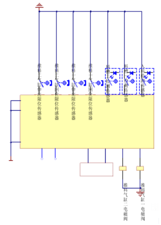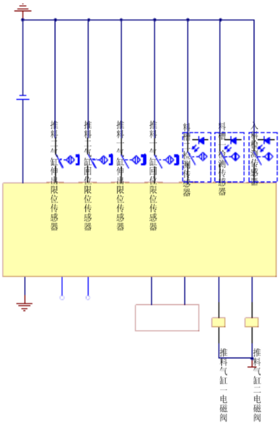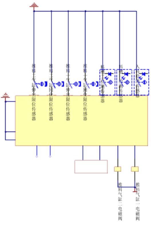 系統(tǒng)啟動,將物料放到光電傳感器前的皮帶上,當(dāng)光電傳感器檢測到有工件進入,即給控制系統(tǒng)發(fā)出信號,控制系統(tǒng)給變頻器發(fā)出啟動信號。變頻器驅(qū)動三相交流電機帶動皮帶轉(zhuǎn)動,當(dāng)物料為金屬時電感傳感器檢測到信號,變頻器停止,推料氣缸一動作,將物料推入第一個料槽;當(dāng)物料為非金屬時電容傳感器檢測到信號,變頻器停止,推料氣缸二動作,將物料推入第二個料槽。