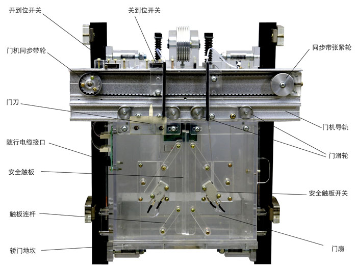 在轎廂門的邊沿上,裝有活動的安全觸板。當(dāng)門在關(guān)閉過程中,安全觸板與乘客或障礙物相接觸時,通過與安全觸板相連的聯(lián)桿,觸及裝在轎廂門上的微動開關(guān)動作,使門重新打開,避免事故發(fā)生。
