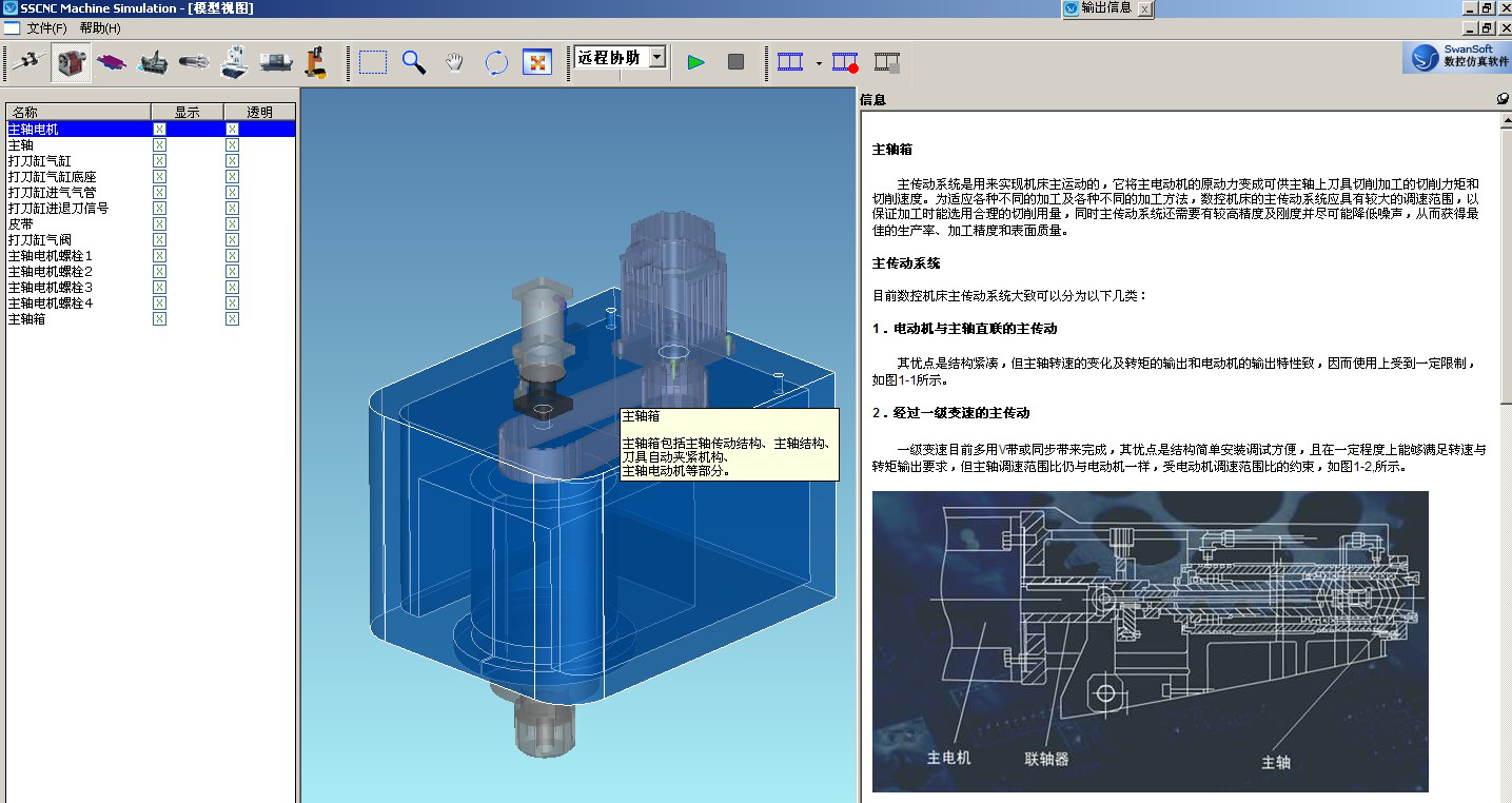 (2) 軟件具有數控車床和銑床的機械結構展示(要求做到每一個機械部件)的3D顯示。銑床包括整機結構、主軸箱總成、伺服總成、絲桿連接總成、Z軸總成等。