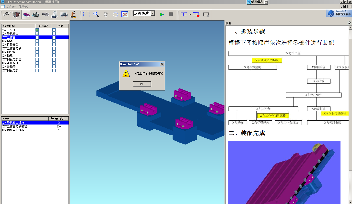 (1) 數控機床結構包含3D數控車床和數控銑床,在結構中能顯示零件名稱、同時可以隱藏或透明零件顯示。軟件具有虛擬互動裝配和拆卸功能,并能自動判斷拆裝操作的正確性。