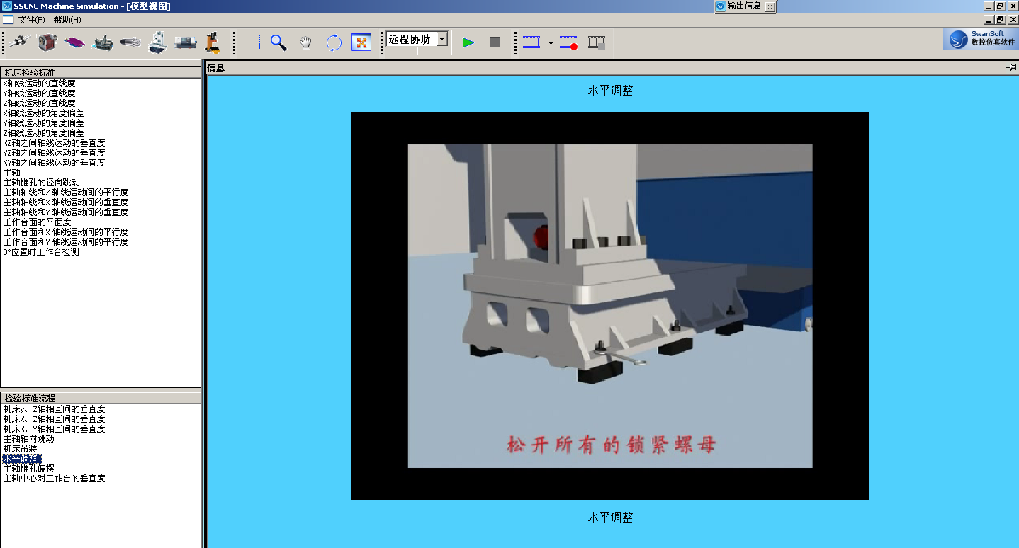 (1) 同時提供裝配的檢驗標準及檢驗流程動畫。包括:X軸直線度檢測、Y軸直線度檢測、Z軸直線度檢測、X軸角度偏差檢測、Y軸角度偏差檢測、Z軸角度偏差檢測、XZ軸垂直度檢測、YZ軸垂直度檢測、XY軸垂直度檢測、主軸錐孔跳動檢測、主軸軸線與Z軸平行度檢測、主軸軸線與X軸垂直度檢測、主軸軸線與Y軸垂直度檢測、工作臺平面度檢測、工作臺和X軸平行度檢測、工作臺與Y軸平行度檢測以及機床吊裝、機床水平調整、主軸中心對工作臺垂直度調整等。