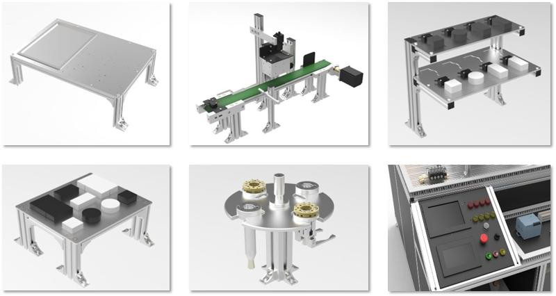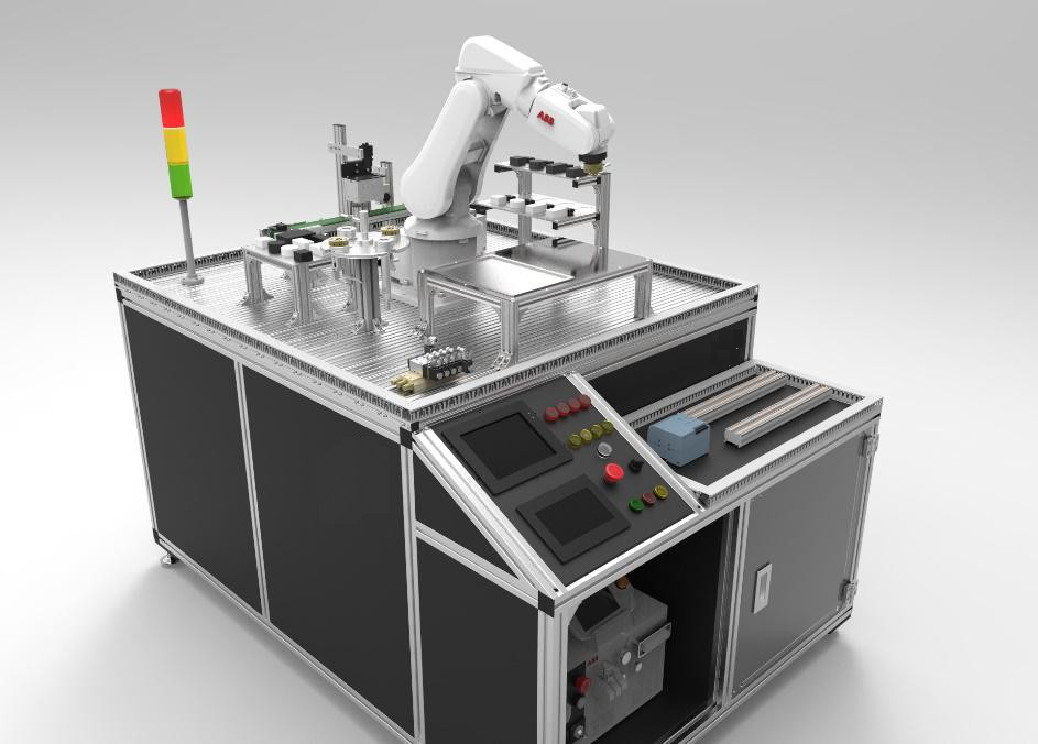 另外,模塊化機(jī)械設(shè)計(jì)是工業(yè)發(fā)達(dá)國(guó)家近二十年來(lái)一直采用的一種先進(jìn)的機(jī)械產(chǎn)品設(shè)計(jì)方法。學(xué)生自主設(shè)計(jì)臺(tái)面功能模塊可作為《機(jī)械設(shè)計(jì)》課程的綜合實(shí)驗(yàn)部分。學(xué)生根據(jù)課上所學(xué)機(jī)械原理和機(jī)械設(shè)計(jì)的基礎(chǔ)知識(shí),在三維設(shè)計(jì)軟件中實(shí)現(xiàn)自己的設(shè)計(jì)想法,可自行設(shè)計(jì)機(jī)器人末端工具,臺(tái)面工裝、生產(chǎn)流水線(xiàn)及視覺(jué)分揀等。學(xué)生也可組隊(duì)完成整個(gè)臺(tái)面的重新規(guī)劃,利用設(shè)備本體提供的氣路和電路總線(xiàn),賦予臺(tái)面新的設(shè)計(jì)亮點(diǎn)。此部分也可作為機(jī)械設(shè)計(jì)、機(jī)械制造、機(jī)電一體化、工業(yè)設(shè)計(jì)等專(zhuān)業(yè)的畢業(yè)設(shè)計(jì)內(nèi)容。此工作站整體外形統(tǒng)一,具有外部通訊接口,所以有配置靈活、便于擴(kuò)展的優(yōu)點(diǎn)。各工作站既可以作為獨(dú)立的功能個(gè)體,完成機(jī)器人的實(shí)訓(xùn)任務(wù)。也可以作為相互的擴(kuò)展模塊,通過(guò)電纜緊密拼裝后組成一個(gè)整體的結(jié)構(gòu)。某一個(gè)工作站作為主控,其他工作站協(xié)同。通過(guò)之前所述不同的設(shè)計(jì)賦予每個(gè)工作站不同的功能, 可添加節(jié)拍控制、生產(chǎn)管理、工業(yè)系統(tǒng)工程等管理思路,使其整體實(shí)現(xiàn)更加多元化的功能。