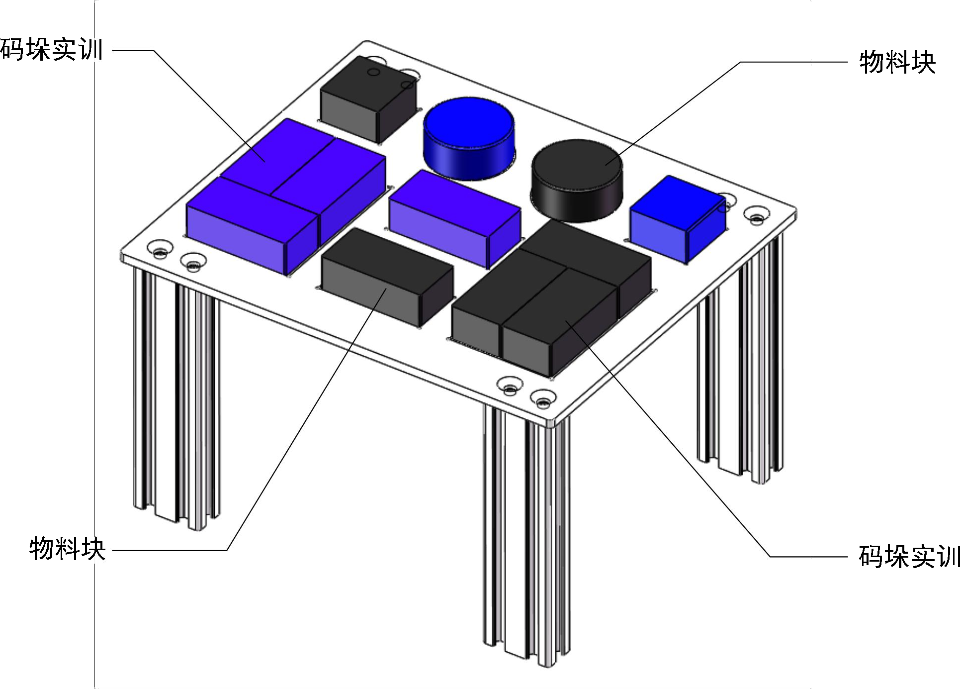 搬運(yùn)碼垛是工業(yè)機(jī)器人應(yīng)用最廣泛的行業(yè)之一,此模塊作為流水線(xiàn)下料的存放臺(tái),臺(tái)面上設(shè)置有與物料形狀對(duì)應(yīng)的 6 個(gè)工位。當(dāng)傳送裝置末端到位傳感器檢測(cè)到有信號(hào)時(shí),會(huì)出發(fā)機(jī)器人將物料塊從傳送帶末端搬運(yùn)到此臺(tái)面對(duì)應(yīng)的工位。同時(shí),此模塊具有兩個(gè)獨(dú)立的碼垛練習(xí)工位,每個(gè)工位有三個(gè)尺寸相同的長(zhǎng)方形碼垛塊,通過(guò)這 6 個(gè)碼垛塊可以練習(xí)數(shù)組和循環(huán)指令的使用。