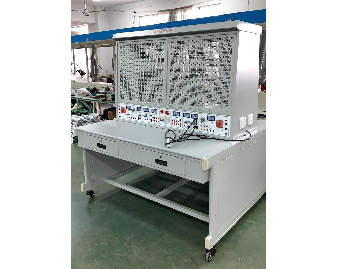 4.3、實訓(xùn)桌為鐵質(zhì)雙層亞光密紋噴塑結(jié)構(gòu),桌面為防火、防水、耐磨高密度板。配有2個抽屜。