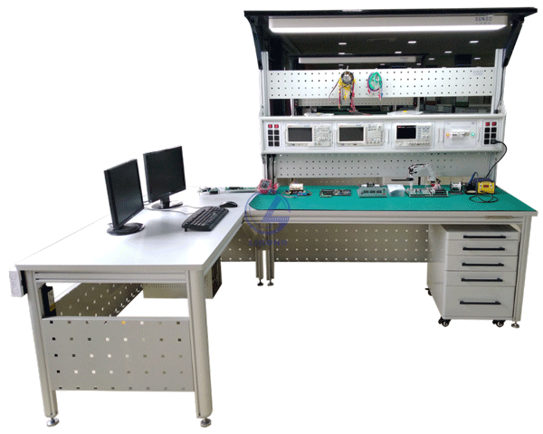 1.工作臺(tái):桌身采用優(yōu)質(zhì)鋁型材做骨架,整機(jī)既堅(jiān)固耐用,美觀大方。桌面采用25mm厚高密度纖維板,外貼防火板,PVC截面封邊,具有耐磨、耐熱、耐污、耐火、耐菌、防霉、抗靜電及易清潔等特點(diǎn)。工作臺(tái)設(shè)有防靜電配套裝置,桌面上方有實(shí)訓(xùn)屏、模塊盒安放橫梁、工具網(wǎng)孔板、高檔條形LED照明。
