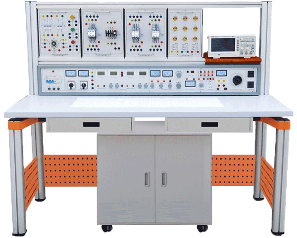 裝置由主機箱、實驗桌、實訓掛箱、獨立封裝實訓電路模塊、移動矮柜、示波器架、學生凳等組成。實訓裝置支架與實訓桌可組合、可拆裝。支架與桌腳一體,鋁合金結構,實訓掛箱、各實驗模塊可根據(jù)實驗需求自由組合放置。