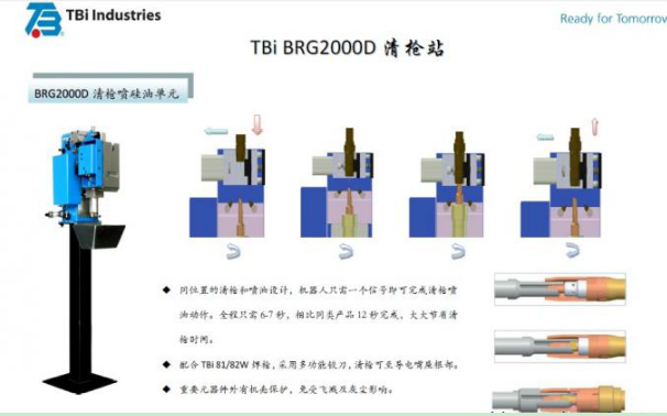 (1)德國TBi BRG-2000D清槍剪絲機(jī)構(gòu)同位置的清槍和噴油設(shè)計,機(jī)器人只需要一個信號就可以完成清槍噴油動作。
