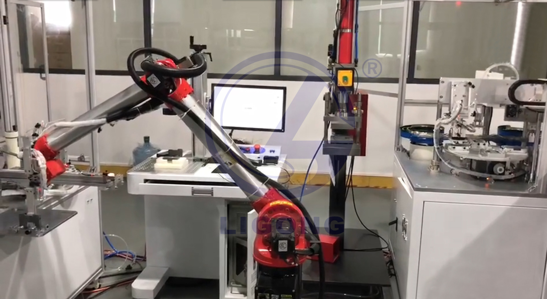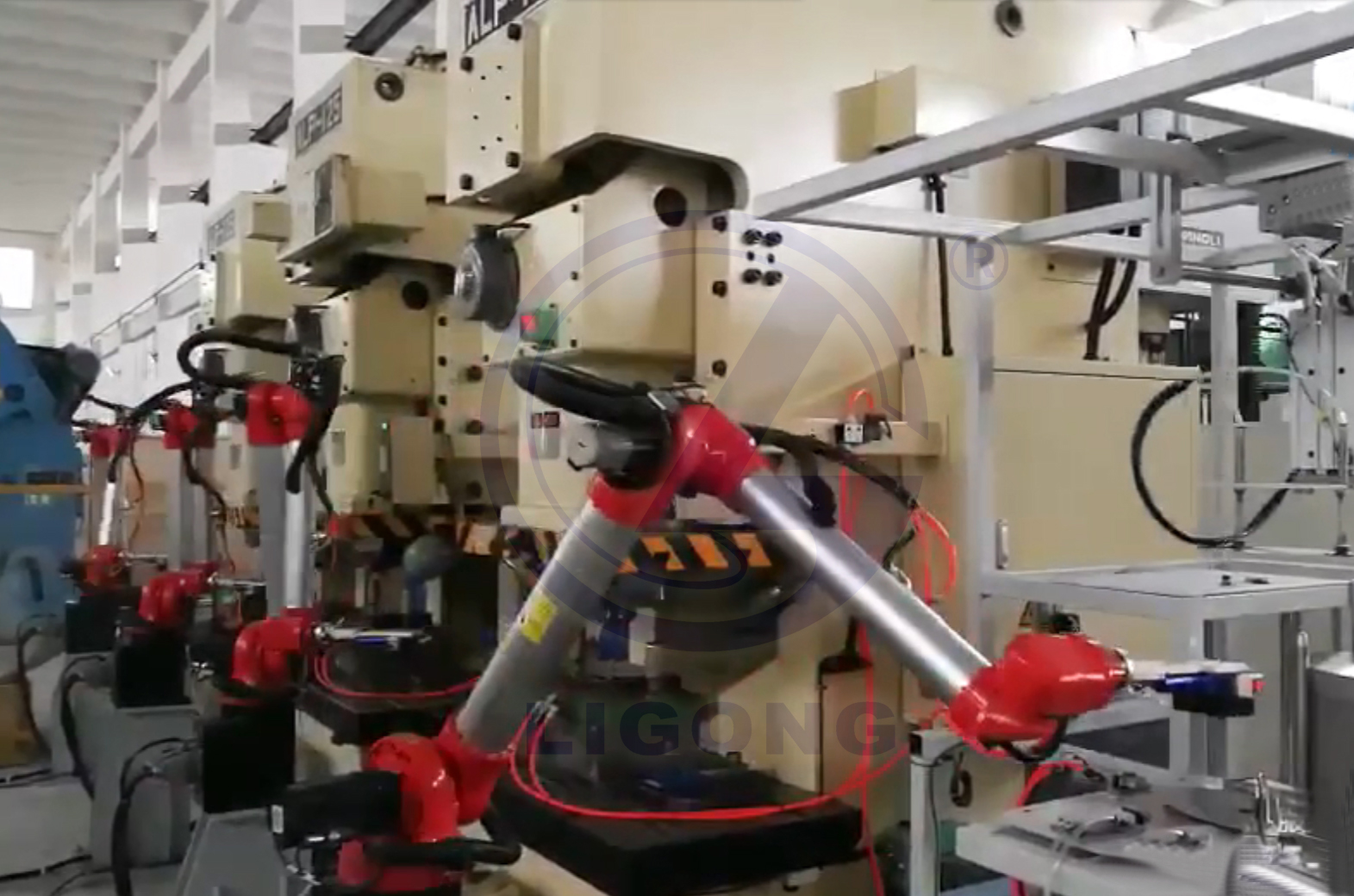 LG-SX系列工業(yè)機(jī)器人打破傳統(tǒng)運(yùn)動(dòng)方式,進(jìn)行創(chuàng)新設(shè)計(jì),在通用六軸工業(yè)機(jī)器人的基礎(chǔ)上, SX系列工業(yè)機(jī)器人新增內(nèi)旋轉(zhuǎn)功能,輕松實(shí)現(xiàn)如鉆工中心等間距很小,但又要求機(jī)器人臂長(zhǎng)大的機(jī)器人完成狹小空間工位間連線或搬運(yùn)。占地面積非常小,運(yùn)動(dòng)運(yùn)動(dòng)非常靈活并且不占用外部空間,為CNC高速鉆工中心特殊設(shè)計(jì)。內(nèi)外雙旋轉(zhuǎn)結(jié)構(gòu),可輕松實(shí)現(xiàn)鉆工中心間距600以內(nèi)狹小空間工位間連線或搬運(yùn),輕松避讓且速度快。