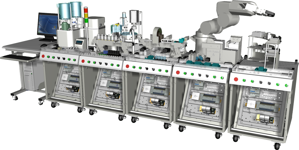 LG-MPS15型 機電一體化綜合實訓(xùn)考核系統(tǒng)是基于《國家中長期人才發(fā)展規(guī)劃綱要(2010-2020年)》對經(jīng)濟社會發(fā)展重點領(lǐng)域急需緊缺專門人才及創(chuàng)新型科技人才的培養(yǎng)要求,依據(jù)國家相關(guān)職業(yè)工種培養(yǎng)及鑒定標(biāo)準(zhǔn),結(jié)合中國當(dāng)前制造業(yè)的崗位需求設(shè)計研發(fā)。機電一體化綜合實訓(xùn)考核系統(tǒng)由“工作站”形式綜合體現(xiàn),“工作站”包含機電一體化“工作島”,電氣裝配臺,機械裝配臺,工具、資料柜及其他附屬工作設(shè)施,不但讓操作者在工作中實習(xí)訓(xùn)練了機電專業(yè)技能,同時也體驗到職業(yè)素養(yǎng)中的社會能力與方法能力。“工作站”的核心是“工作島”,由MPS模塊化生產(chǎn)線設(shè)備組成,共分為液體混合灌裝、組裝加工、檢測判別、機器人和智能倉儲五個工作島設(shè)備組成,工作島由PLC、變頻器、伺服驅(qū)動、步進驅(qū)動、氣動元件、觸摸屏等工業(yè)控制器件構(gòu)成,操作者需要具備機械裝調(diào)、電氣管路連接、程序設(shè)計、機器人操作、傳感器裝調(diào)、檢修排故、觸摸屏組態(tài)等現(xiàn)代制造業(yè)崗位必要的技能,設(shè)備技術(shù)涵蓋面廣,定位具有前瞻性,是機電一體化專業(yè)教學(xué)實習(xí)、技能鑒定和技能競賽的絕佳載體。