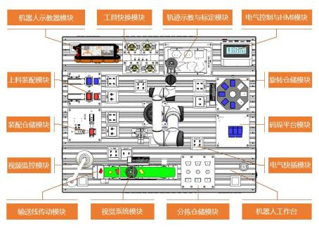 工作臺整體由兩個基礎(chǔ)臺拼接而成,更具空間靈活,拆卸方便等特點(diǎn)。臺面采用標(biāo)準(zhǔn)鋁型材,機(jī)器人 及功能模塊可根據(jù)需求改變布局位置,所有功能模塊采用手?jǐn)Q螺栓方式固定,可實(shí)現(xiàn)無工具快速拆裝與更 換。每個模塊電氣部分配置了獨(dú)立的電氣接線盒和快速航插,可實(shí)現(xiàn)模塊整體機(jī)械和電氣快速安裝部署, 還可根據(jù)需求更換或添加功能模塊進(jìn)行功能擴(kuò)展。