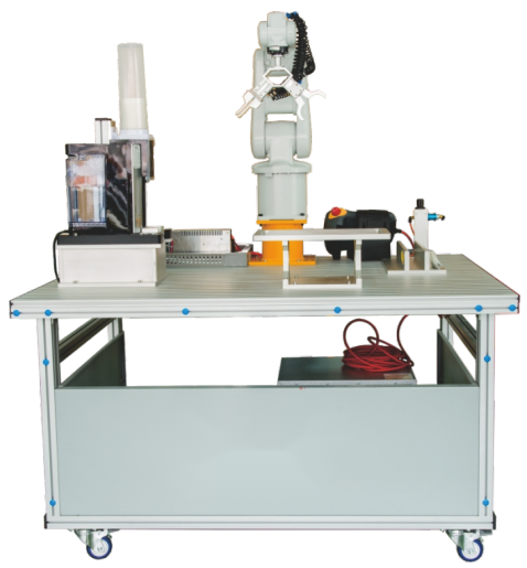 該裝置采用鋁木結(jié)構(gòu)試訓(xùn)臺,由實訓(xùn)桌、飲水機(jī)(自動售賣機(jī))、取杯器、工業(yè)機(jī)器人(帶復(fù)合手爪),底座(支架)等幾個部分組成,利用工業(yè)機(jī)器人完成茶藝流程一系列的動作。該設(shè)備圍繞工業(yè)機(jī)器人展開內(nèi)容,從通訊、機(jī)械、電氣三方面突出顯示其在服務(wù)業(yè)中的運用,為學(xué)習(xí)自動化提供全面教學(xué)便利。