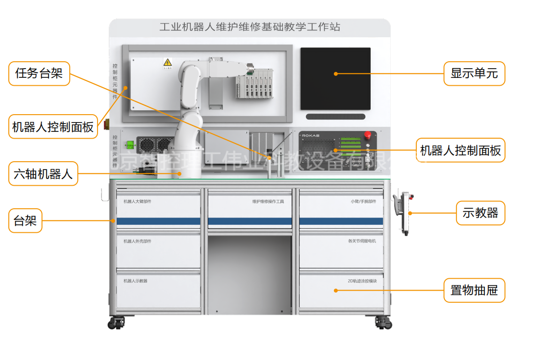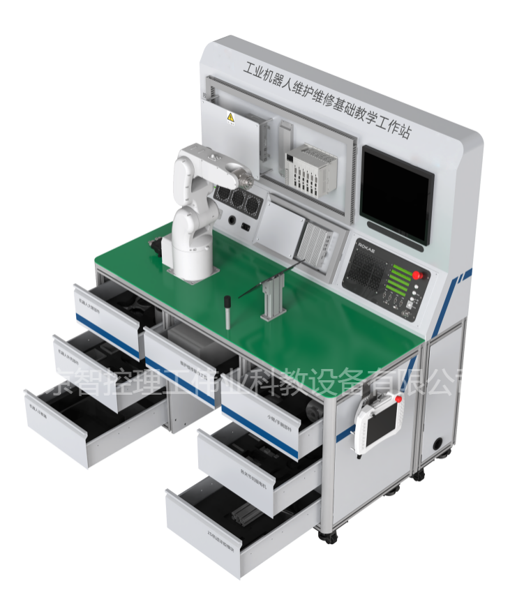 工業(yè)機器人維護(hù)維修基礎(chǔ)教學(xué)工作站,以工業(yè)機器人本體及其控制系統(tǒng)最常見維護(hù)維修操作為核心,通過對典型故障的診斷和排除,按照規(guī)范步驟完成對工業(yè)機器人本體的拆裝過程,并根據(jù)圖紙要求搭建控制系統(tǒng)并接線,由零件級深入了解工業(yè)機器人的構(gòu)成形式和運動方式,掌握基礎(chǔ)維護(hù)維修技能。工作站配套了與生產(chǎn)廠家完全相同的工裝、工具,讓學(xué)生可以在教學(xué)環(huán)境中充分體驗高精度機電設(shè)備的生產(chǎn)工藝要求,確實掌握維護(hù)維修技能。