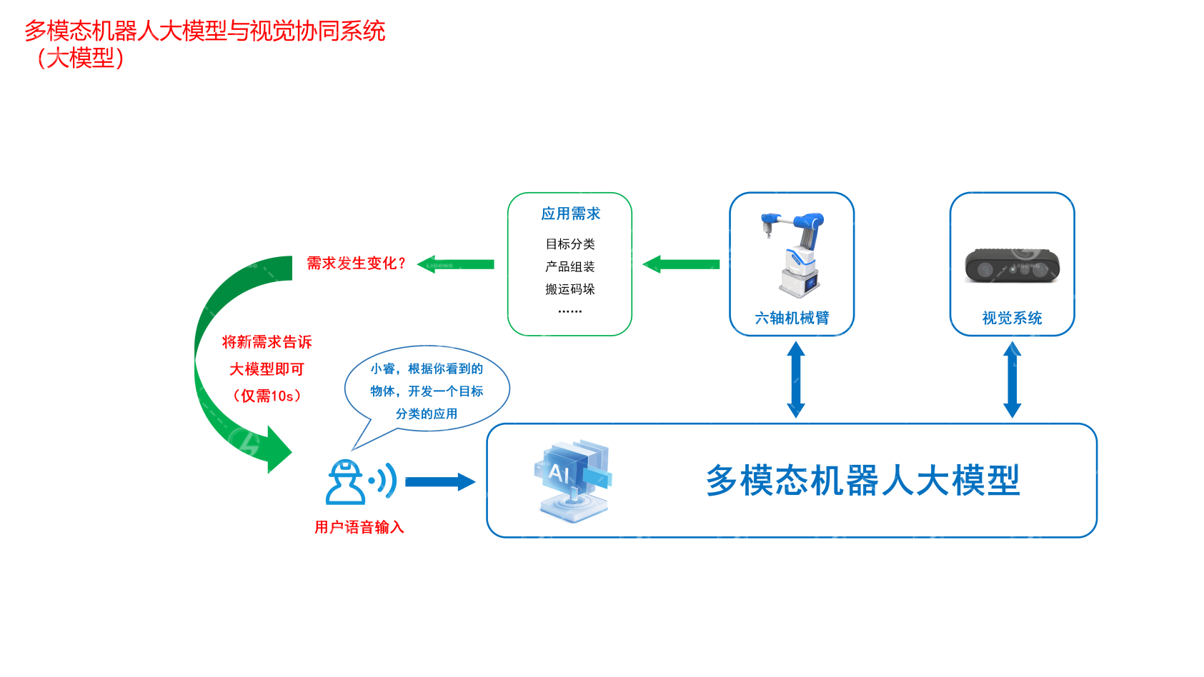 隨著人工智能技術(shù)的飛速發(fā)展,特別是大模型(如深度學(xué)習(xí)模型、生成式AI等)的廣泛應(yīng)用,機(jī)器人領(lǐng)域正迎來一場前所未有的變革。大模型以其強(qiáng)大的數(shù)據(jù)處理能力、泛化能力和跨模態(tài)融合能力,為機(jī)器人提供了前所未有的智能水平。在這一背景下,研發(fā)了多模態(tài)機(jī)器人大模型與視覺協(xié)同系統(tǒng),該系統(tǒng)以大模型為核心,以機(jī)器人為執(zhí)行結(jié)構(gòu),以視覺系統(tǒng)為環(huán)境感知單元,可以快速地實(shí)現(xiàn)對多種應(yīng)用需求的自主分析、理解和開發(fā),可以有效的提高生產(chǎn)效率。同時(shí),為有效的服務(wù)于用戶的科研、開發(fā)等需求,該系統(tǒng)還開放大模型訓(xùn)練、部署的全部流程,并開放全部的機(jī)器人、視覺、語音的源代碼,用戶可以在此基礎(chǔ)上,進(jìn)行多個(gè)方向的探索和實(shí)踐。