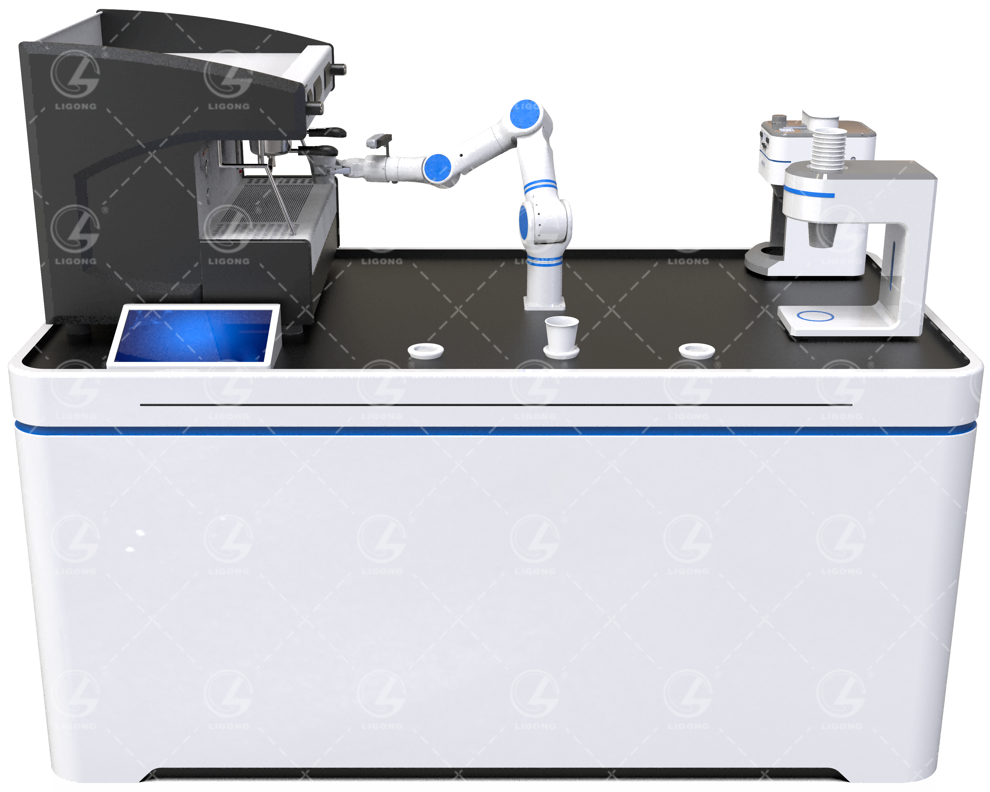 (2)平臺上方安裝有七軸手臂、咖啡機(jī)、牛奶機(jī)、紙杯存儲單元、顯示屏等設(shè)備,可實(shí)現(xiàn)全自動的咖啡制作流程;