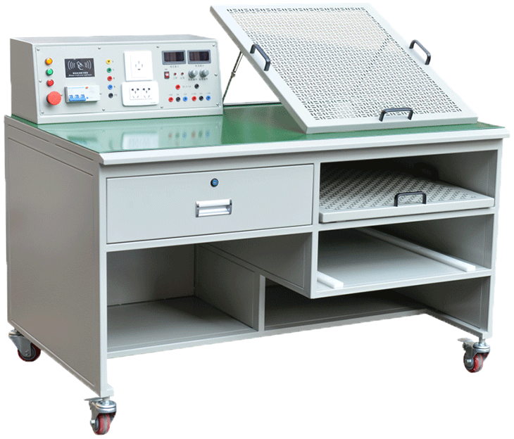 實(shí)訓(xùn)裝置由電源部分、實(shí)操部分、儲(chǔ)物部分組成。桌面設(shè)計(jì)高度750mm符合人體工程學(xué),滿足絕大部分使用者的使用體驗(yàn),底部裝有4個(gè)萬(wàn)向福馬輪,方便移動(dòng)和固定。