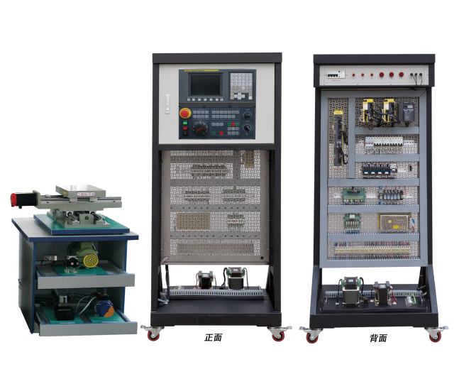 2、機床實訓(xùn)柜采用鐵質(zhì)亞光密紋噴塑結(jié)構(gòu),正面裝有數(shù)控系統(tǒng)和操作面板,背面為機床電氣柜,柜內(nèi)器件布局與實際機床廠的模式一致。電氣柜內(nèi)的電氣安裝板為不銹鋼網(wǎng)孔板,上面裝有變頻器、伺服驅(qū)動器、交流接觸器、繼電器、保險絲座、斷路器、開關(guān)電源、接線端子排和走線槽等;電氣柜底部還設(shè)有變壓器和接地端子等。