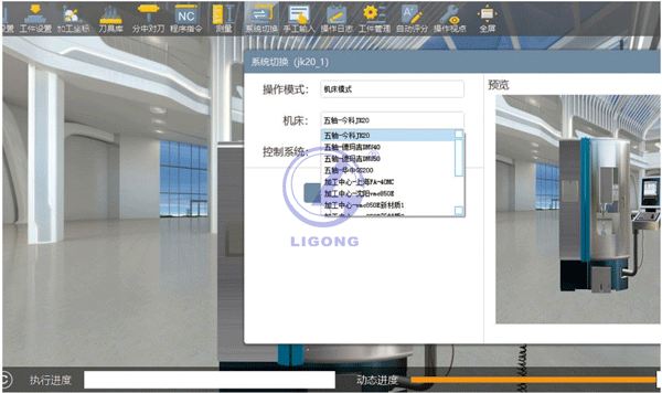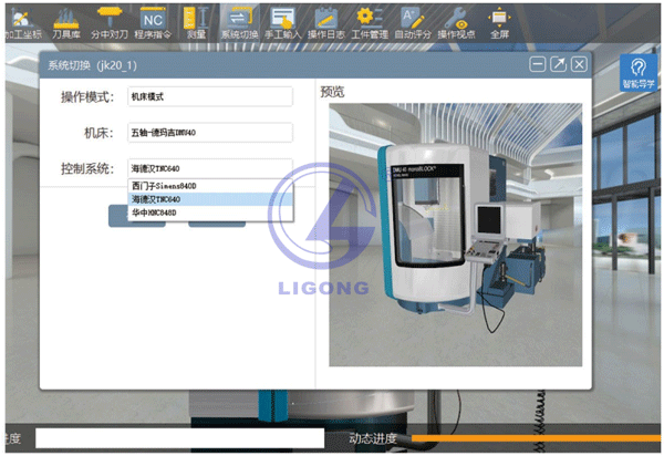 LGS-SX02型 數(shù)控車銑加工一體化創(chuàng)新仿真實訓平臺的數(shù)字孿生機床仿真部分,操作極為簡單,放大、縮小、旋轉(zhuǎn)、平移、觸控等等。學生無需特殊訓練,即可直接上手使用??芍С职ㄈS的數(shù)控機床如法蘭克、西門子、華中、廣數(shù),以及多軸的數(shù)控機床如西門子840D、華中848D、海德漢TNC640等主流操作系統(tǒng),支持加工中心、車床、斜床等數(shù)控機床設備,目前數(shù)控I8多軸智能訓練機包含了11套不同類型數(shù)控系統(tǒng)設備。