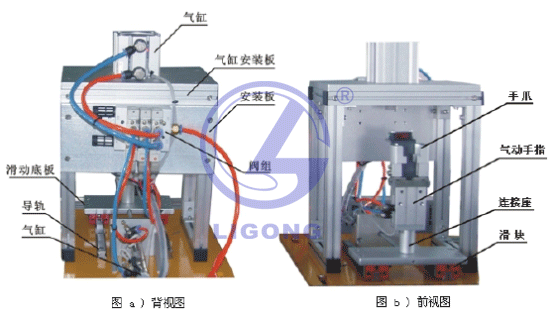 選用該裝置配置的單出桿氣缸、單出雙桿氣缸、旋轉氣缸等氣動執(zhí)行元件和單控電磁換向閥、雙控電磁換向閥和磁性開關等氣動控制元件,可完成下列氣動技術的工作任務: