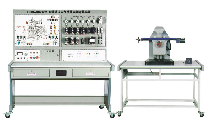 LGDQ-X62W 型 萬能銑床電氣技能實訓(xùn)考核裝置 ( 半實物 )由電源控制部分、機床電氣控制部分、半仿真機床實物部分構(gòu)成。電源控制部分包括實訓(xùn)定時、定時報警、安全用電自動控制等,機床電氣控制部分把整臺機床內(nèi)部電器裝在正面面板上,能直觀地觀察機床工作時各電器的動作狀況。故障點在面板上設(shè)有相應(yīng)測試點,供實訓(xùn)考核者測試用。仿真機床部分能模擬機床各種運動。通過萬能銑床電氣技能實訓(xùn)考核裝置 的實訓(xùn)能使學(xué)員掌握機床常見故障的現(xiàn)象、故障產(chǎn)生的大概部位,熟練掌握機床電路工作原理,其是維修電工初、中、高級技能鑒定的理想實訓(xùn)設(shè)備。