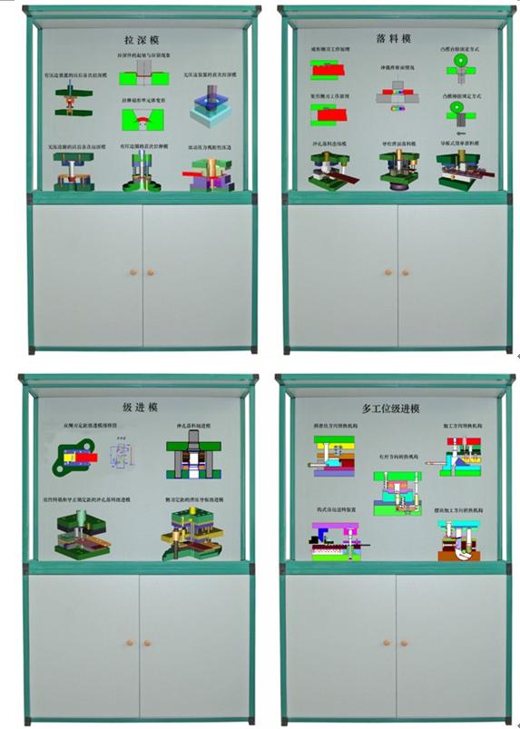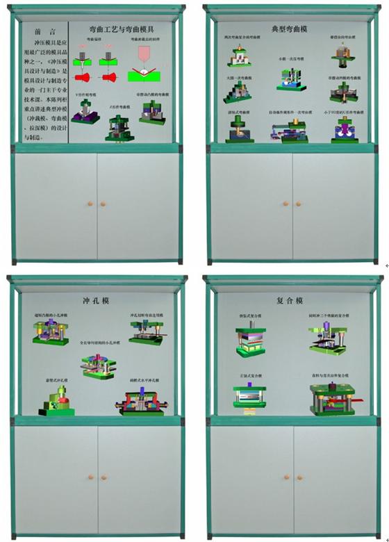CLG-N04型 多媒體智能控制《沖壓模具設計與制造》陳列柜是模具設計與制造專業(yè)的一門主干專業(yè)技術課。適用于《沖壓模具設計與制造》、《沖模設計應用實例》等課程。本課程是以教育部高教司《關于加強高職高專人才培養(yǎng)工作的若干意見》等文件對高職高專人才培養(yǎng)的要求為指導思想。采用多種素材和媒體手段,講述典型沖模(沖裁模、彎曲模、拉深模)的設計與制造,適度介紹了多工位級進模設計與制造。陳列柜共分八個柜和一個電腦控制臺,進行多媒體聲控同步解說演示。柜內47件模型均采用動畫圖像由PC電腦軟件控制順序或任選播放演示沖壓模具功能原理。