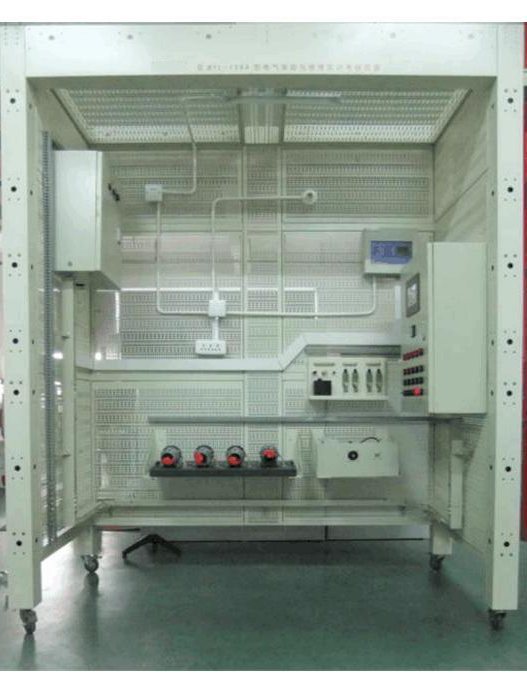 1、模擬房:整體以鋁合金型材、鋼制網(wǎng)孔板和木工板組成梯形基本外框架,更真實模擬施工現(xiàn)場,更換方便,可進行電器的安裝與布線;模擬房正面一側(cè)立柱是電源控制系統(tǒng),帶有總電源控制、急停按鈕和多組漏電保護,具有電源指示運行指示和照明開關(guān),單獨提供220V、380作安裝實訓(xùn)時使用電動工具的供電電源。工業(yè)防水插座和38V碟插端子提供220V、380電源輸出用于實訓(xùn)調(diào)試運行,模擬房內(nèi)部采用LED燈照明;