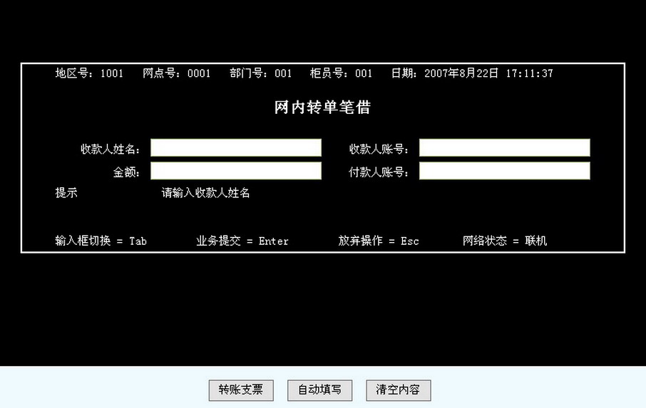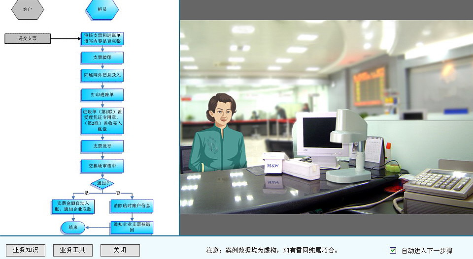 學生在經(jīng)過基礎的實務課程學習后,將被置于一個完全仿真的現(xiàn)代商業(yè)銀行的工作環(huán)境中,面對銀行每日的工作開始進行模擬實操。學生們將會面對虛擬的客戶提出的各種要求來進行相應的處理。對于學生來講,實操過程中的所有操作都是自由的,他們需要通過完全自主的思考來判斷下一步的操作。譬如客戶提出的支票轉帳請求是否受理?如果不受理理由是什么?(譬如涉及支票的鑒別、簽章的鑒別等)接受以后如何操作?同時模擬系統(tǒng)根據(jù)內置的業(yè)務邏輯自動判斷學生操作的正確性,對其業(yè)務能力進行實時的評價和記錄,并且將結果及時反饋給學生。通過每一步操作的自主思考和系統(tǒng)不斷的提示加強學生對于業(yè)務處理的理解,幫助其提高業(yè)務操作的熟練程度,并且培養(yǎng)其判斷分析能力。實操訓練的內容完全參照日常銀行業(yè)務操作所涉及的范圍,同時也可以根據(jù)實驗課程主題的要求進行具體的靈活配置。
