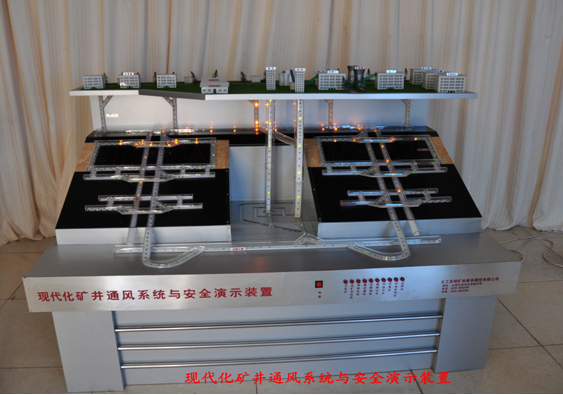 該現(xiàn)代化礦井通風(fēng)系統(tǒng)與安全實(shí)驗(yàn)裝置(適合于二、三、四級),由井上下兩部分構(gòu)成,地面示意現(xiàn)代化礦井的工業(yè)廣場;井下采用光、電顯示并列式、分區(qū)式、對角式、中央邊界式等通風(fēng)方式及掘進(jìn)通風(fēng)、全礦井反風(fēng)、局部反風(fēng)等,并顯示出煤層注水,瓦斯抽放,均壓滅火等安全防預(yù)系統(tǒng)。