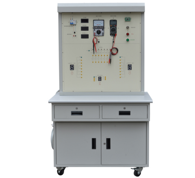 (1)實訓臺主體部分采用全鋼結(jié)構,鋼板亞光噴塑,美觀耐用,臺面采用鋁塑板印制而成,整個實訓臺由漏電保護開關、熔斷器、開關電源、數(shù)顯計時器、智能刷卡啟動電路板、七段數(shù)碼管(共陰)、七段數(shù)碼管(共陽)、方向數(shù)碼管、交流接觸器、數(shù)字電壓表、數(shù)字電流表、指針萬用表、數(shù)字萬用表、照明日光燈、帶鎖開關、按鈕開關、鈕子開關、電阻器和安全接線柱等組成。