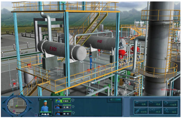 按實(shí)際現(xiàn)場(chǎng)設(shè)備的外形、尺寸、顏色、位置關(guān)系及距離、管線連接方式、音響效果等物理屬性建立3D場(chǎng)景和設(shè)施,包括防火堤、滅火器、消防水炮等各種安全設(shè)施。
