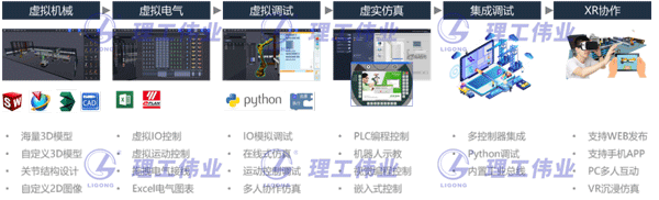 IMT數(shù)字孿生系統(tǒng)能夠從虛擬機械設計、虛擬電氣接線再到虛實互動編程,虛擬調試以及集成調試的整個過程,同時配置XR互動仿真,能夠實現(xiàn)多人協(xié)作的沉浸式應用,IMT系統(tǒng)具有多種仿真和組合方式,支持半實物、全虛擬、以及3D互動的編程方式。