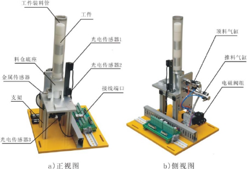 主要由井式工件庫(kù)、推料氣缸、物料臺(tái)、光電傳感器、磁性開(kāi)關(guān)、電磁閥、支架、機(jī)械零部件構(gòu)成。