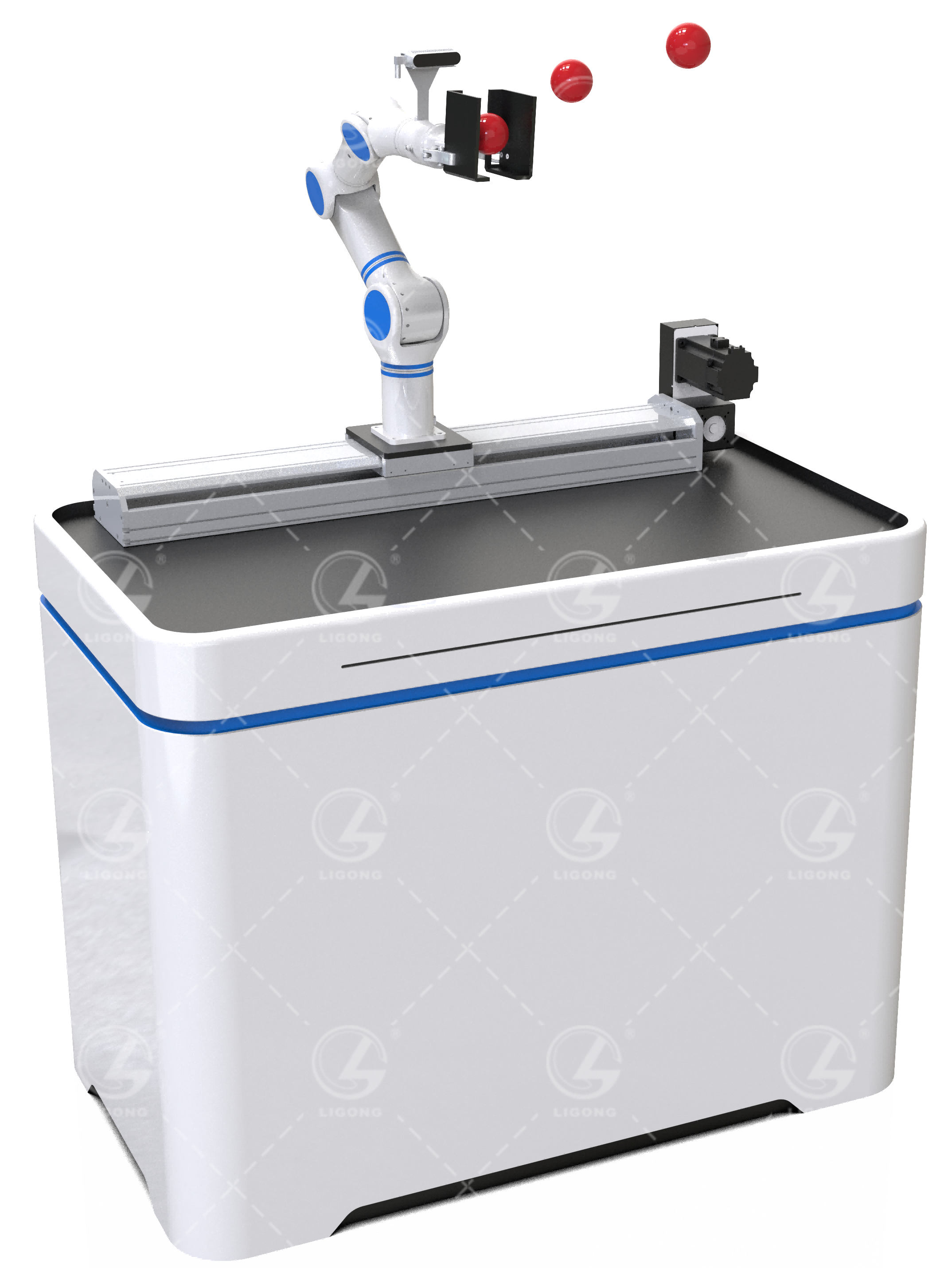 (13)具備機(jī)器人空中動態(tài)目標(biāo)實(shí)時捕獲功能:手臂可根據(jù)視覺系統(tǒng)反饋的目標(biāo)軌跡和距離,實(shí)時控制移動導(dǎo)軌的運(yùn)動方向,并調(diào)節(jié)手臂末端的空間姿態(tài),當(dāng)目標(biāo)到達(dá)手臂末端時,可自動捕獲目標(biāo)物體,支持捕獲如乒乓球、網(wǎng)球、皮球等不少于三種彈性物體。